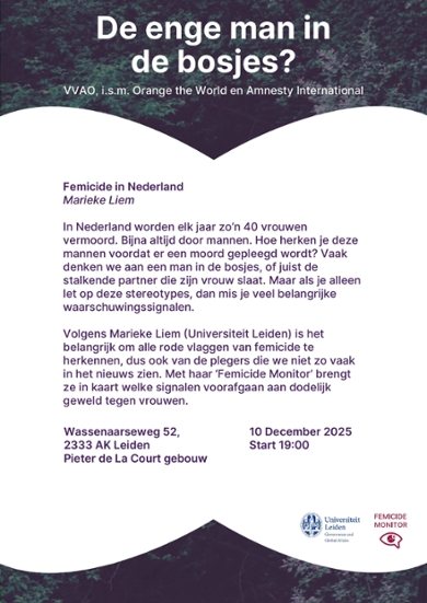 In light of the Orange the World campagin, the Faculty of Governance and Global Affairs is organising a series of events to raise awareness about violence against women and girls. The campaign is a global initiative by UN Women and takes place each year from 25 November (International Day for the Elimination of Violence Against Women) 10 December (Human Rights Day). The themes closely connect to the faculty's research on femicide, justice, human rights and governance.