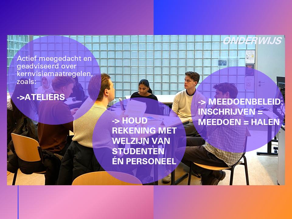 Discussed and advised on Kernvisie measures such as: Ateliers; attention for staff and student well-being; and policy on exam participation: registering=participating=success -