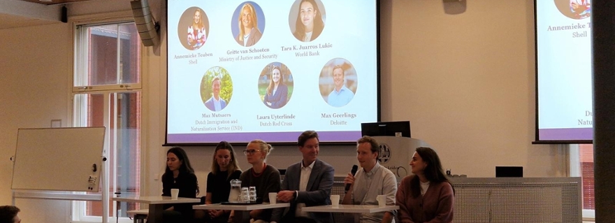 They shared their experiences while offering advice to current students. The panel included Max Geerlings (Deloitte), Annemieke Teuben (Shell), Gritte van Schooten (Ministry of Justice and Security), Tara K. Juarros Lukic (World Bank), Max Mutsaers (IND), and Laura Uyterlinde (Red Cross). During the session, they discussed which skills truly matter, the daily realities of crisis-related roles, and offered practical career advice to current students.