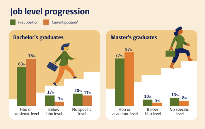 The research shows that continuing studies after a bachelor’s degree is worthwhile. Alumni with a master’s degree more often secure higher-level positions: 77% begin at higher professional or academic level, compared to 63% of bachelor’s graduates. After more than two years of work experience, 87% of master’s alumni hold a position at higher professional or academic level, compared to 76% of bachelor’s alumni. The higher the level of the work, the more satisfied alumni generally are with their career progression.