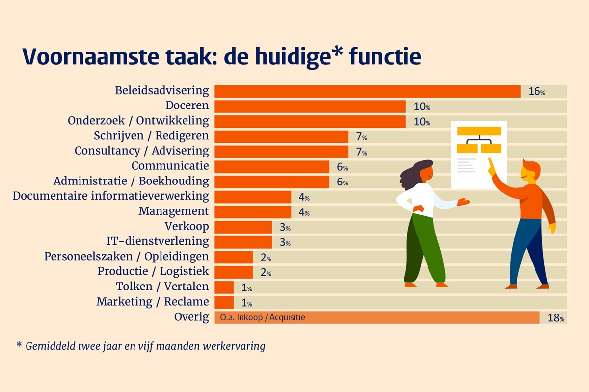 Most Humanities master’s graduates find their first job in (semi-)government (21%), education (16%), or research (8%), followed by the arts and culture sector (6%), communication and marketing (5%), and media and journalism (5%). After more than two years of work experience, (semi-)government (23%), education (15%), and research (10%) remain the most common sectors. Their daily tasks primarily involve advising, writing and editing, research, and providing information and communication.