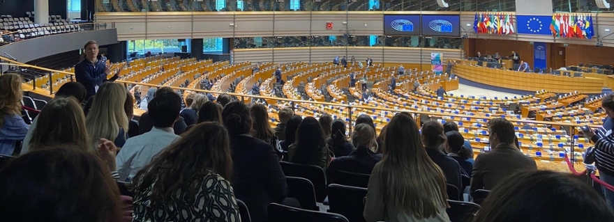 MIRD Alumnus Rijk Willers, now based in Brussels, receives MIRD students at the European Parliament's main meeting hall -