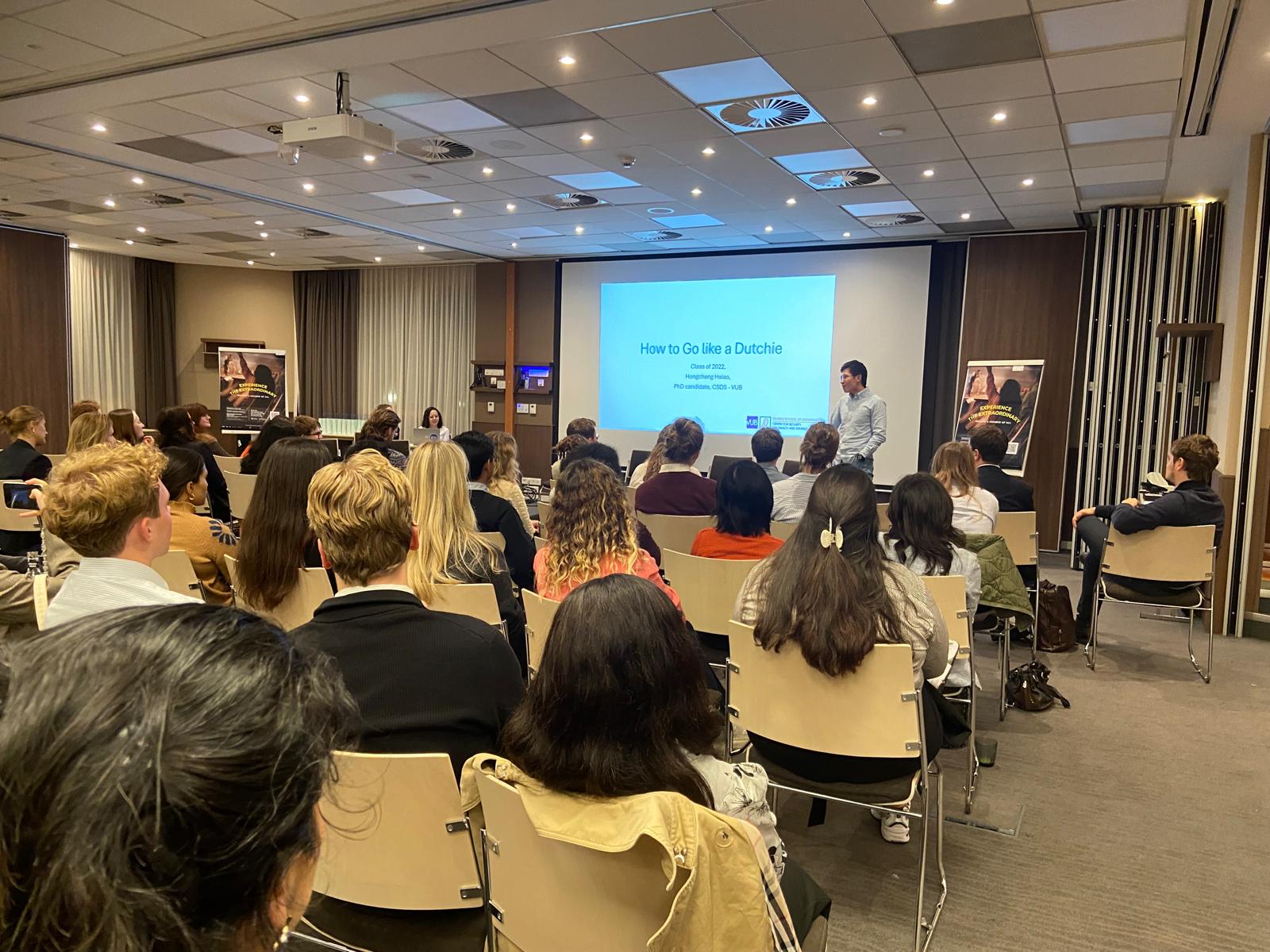 Alumni panel of speakers Rijk Willers, Clara Panella Gomez, Vlad Badea, and Mihai Damascan (Left to Right) share their experience and advice with the first-year MIRD students -