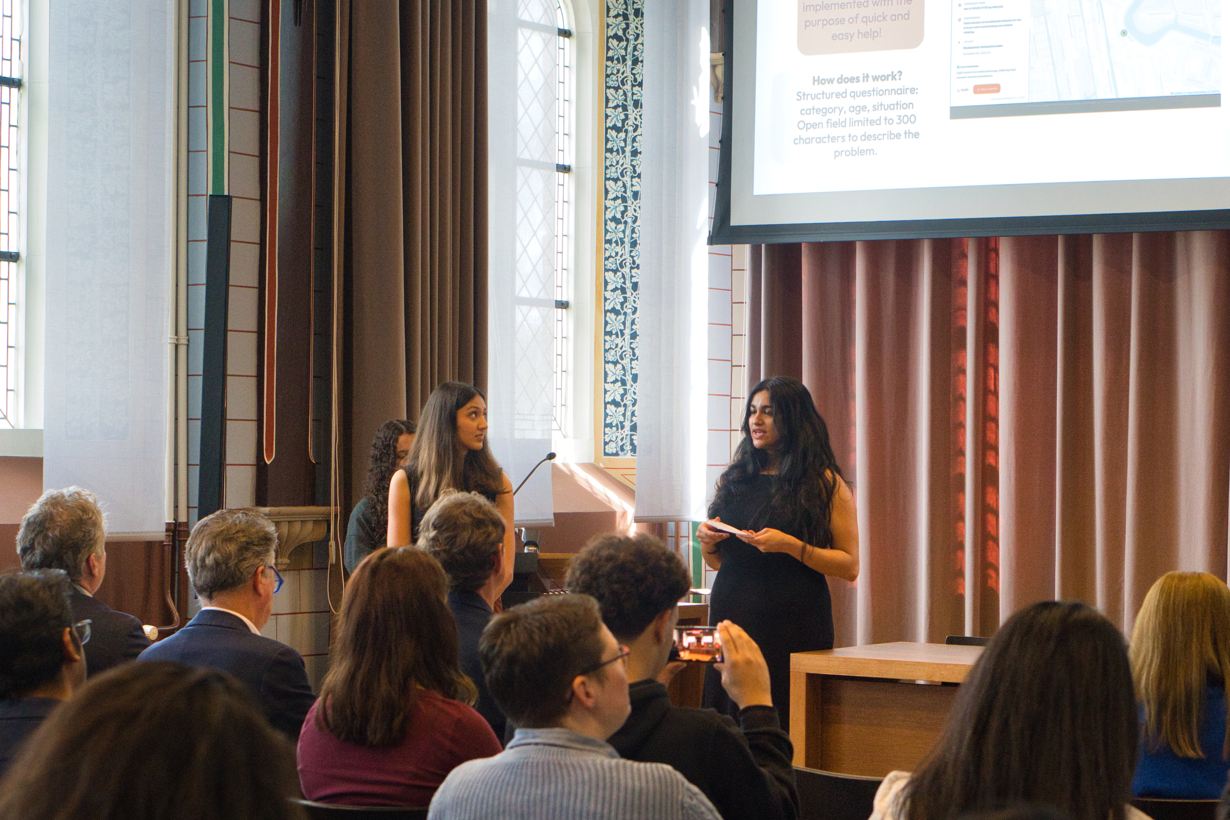 First prize went to Team 1, consisting of students Simar Suri, Mia van Gellecum, Nicole Stafanov, Tanisha Sandeep Phadke, Ana Fadul Ramos, and Lucas Danielian. They developed a social map for the Municipality of Leiden, allowing users to easily see which social services they are entitled to. With this, they won the grand prize of €3,000.