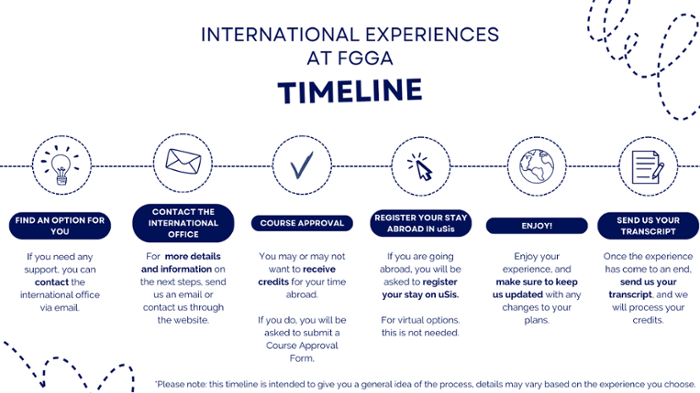 Below you can find a timeline for the next steps. This timeline is intended to give you a general idea of the process, but details might change based on the specific option you choose. Once you contact the International Office, we will send you an email with more detailed instructions.