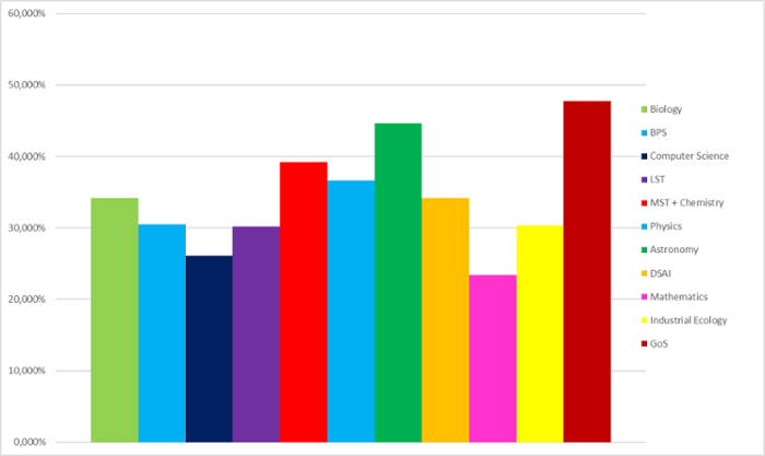 Dit jaar vulde 33,78% van de studenten van de faculteit W&N de NSE in. Dat is hoger dan het universitaire gemiddelde van 30,74%.