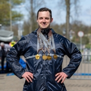Ryan Westernacher-Schneider neemt maar liefst vier medailles mee naar huis. De post-doc van de Sterrewacht vormde een eenmansteam en legde het parcours van vijf kilometer dus vier keer af. Door attributen als een pruik of plaksnor zag hij er elke ronde nét even anders uit. ‘Ik had nog nooit twintig kilometer gelopen, dus ik vond het een mooie uitdaging om dat eens te proberen.’