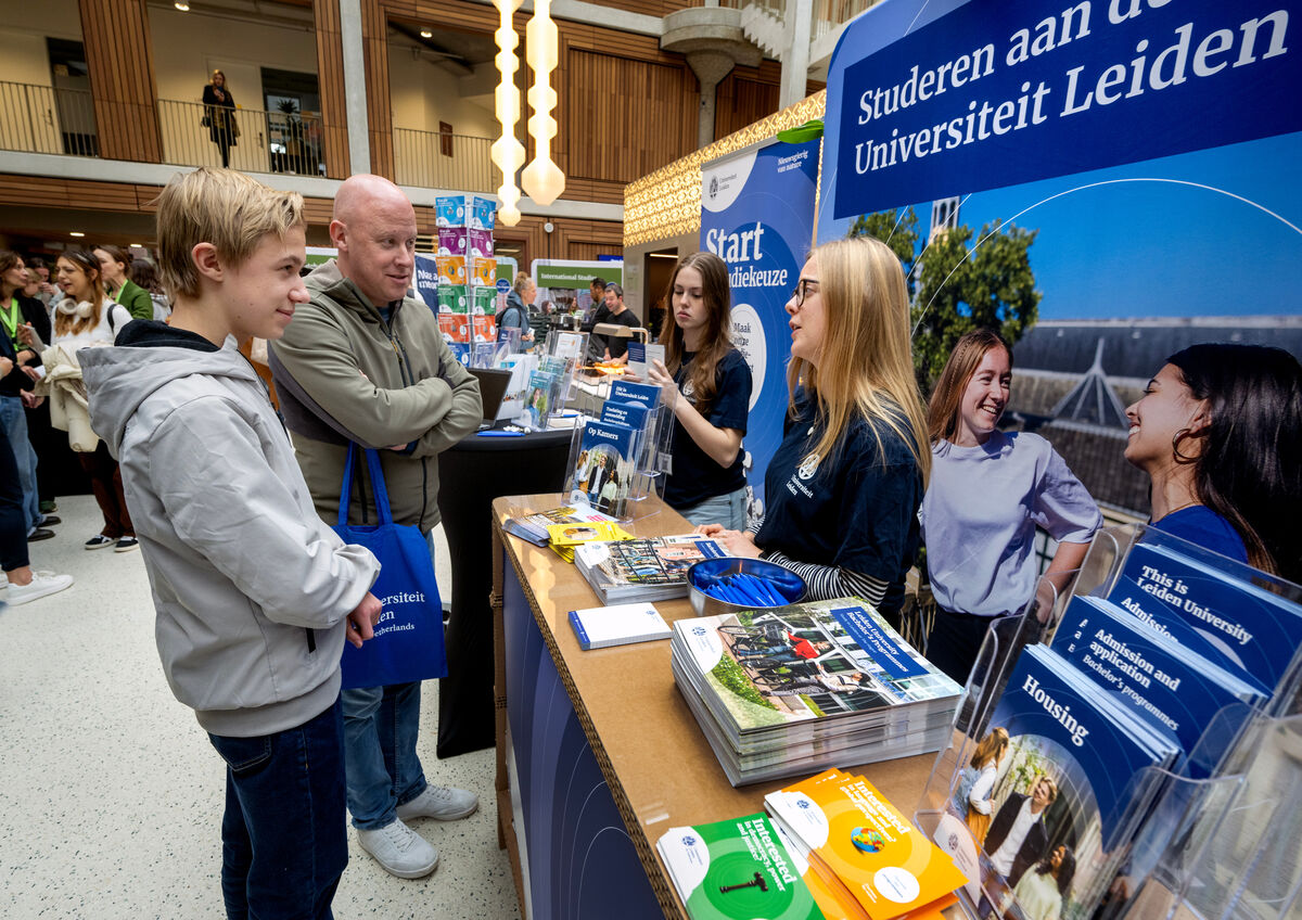 Ze druppelen binnen op deze druilerige zaterdag: studiekiezers die samen met vaders, moeders, vrienden en vriendinnen de Open Dag van Universiteit Leiden bezoeken. Zowel in Leiden als in Den Haag laten alle faculteiten zien welke studies er zijn. En dat zijn er nogal wat.  Zo ook in het Herta Mohr-gebouw.