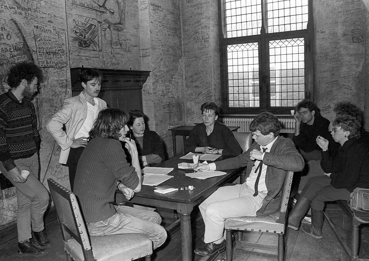 Druk overleg in het Zweetkamertje. In 1969 was Rohde niet bij de bezetting van het Academiegebouw maar in 1985 wel. Foto: Fred Rohde -