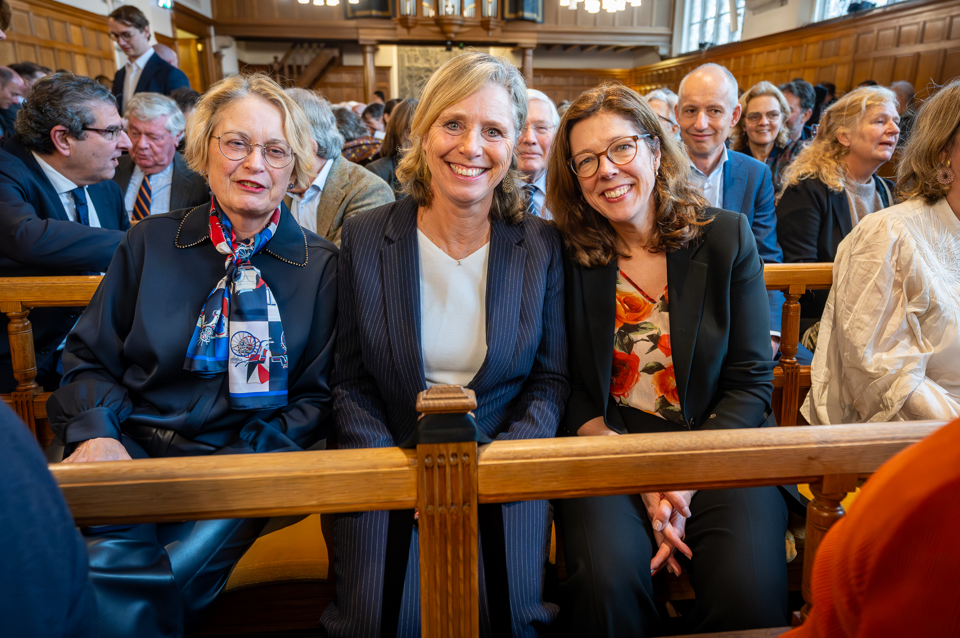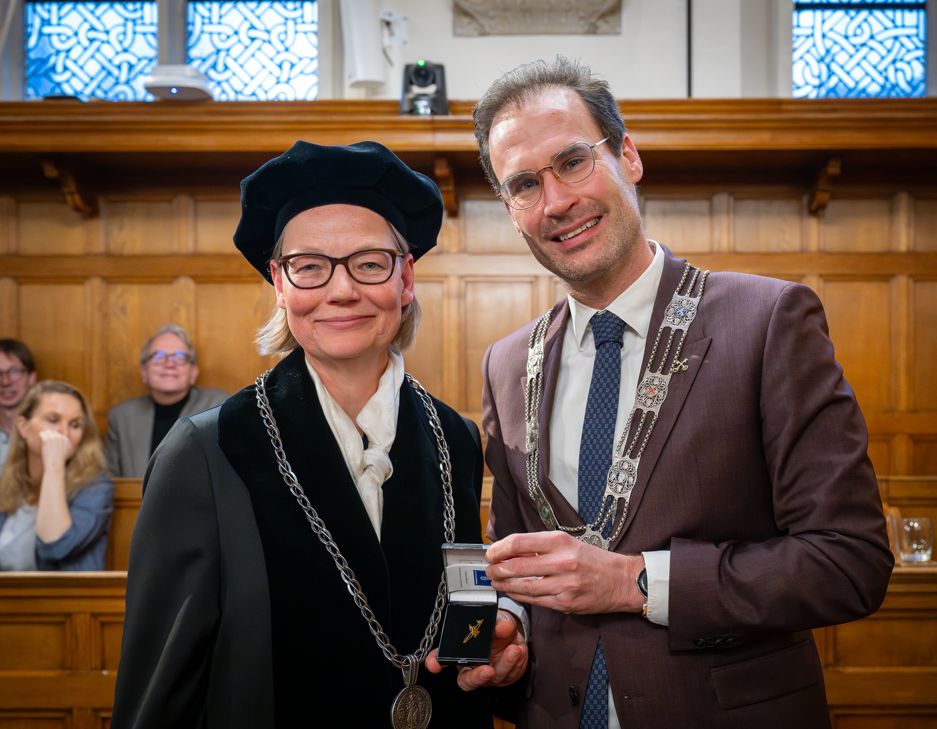 Tijdens het afscheid kreeg Bijl ook twee onderscheidingen. Wageningen-rector Carolien Kroeze, tevens voorzitter van het rectorencollege, gaf Bijl de Legpenning, de erepenning die scheidende rectoren ontvangen. ‘In het rectorencollege delen we lief en leed en leren we van elkaar. Hester kon ik altijd bellen bij ingewikkelde kwesties.’ Ook verwelkomde Kroeze van harte de nieuwe aanstaande rector, Sarah de Rijcke, die ook aanwezig was. De Leidse burgemeester Peter Heijkoop reikte de Gouden Speld uit ‘voor jouw betekenis voor de stad en de universiteit’. ‘Je bestuurt niet om zelf te schitteren, maar om dingen mogelijk te maken.’