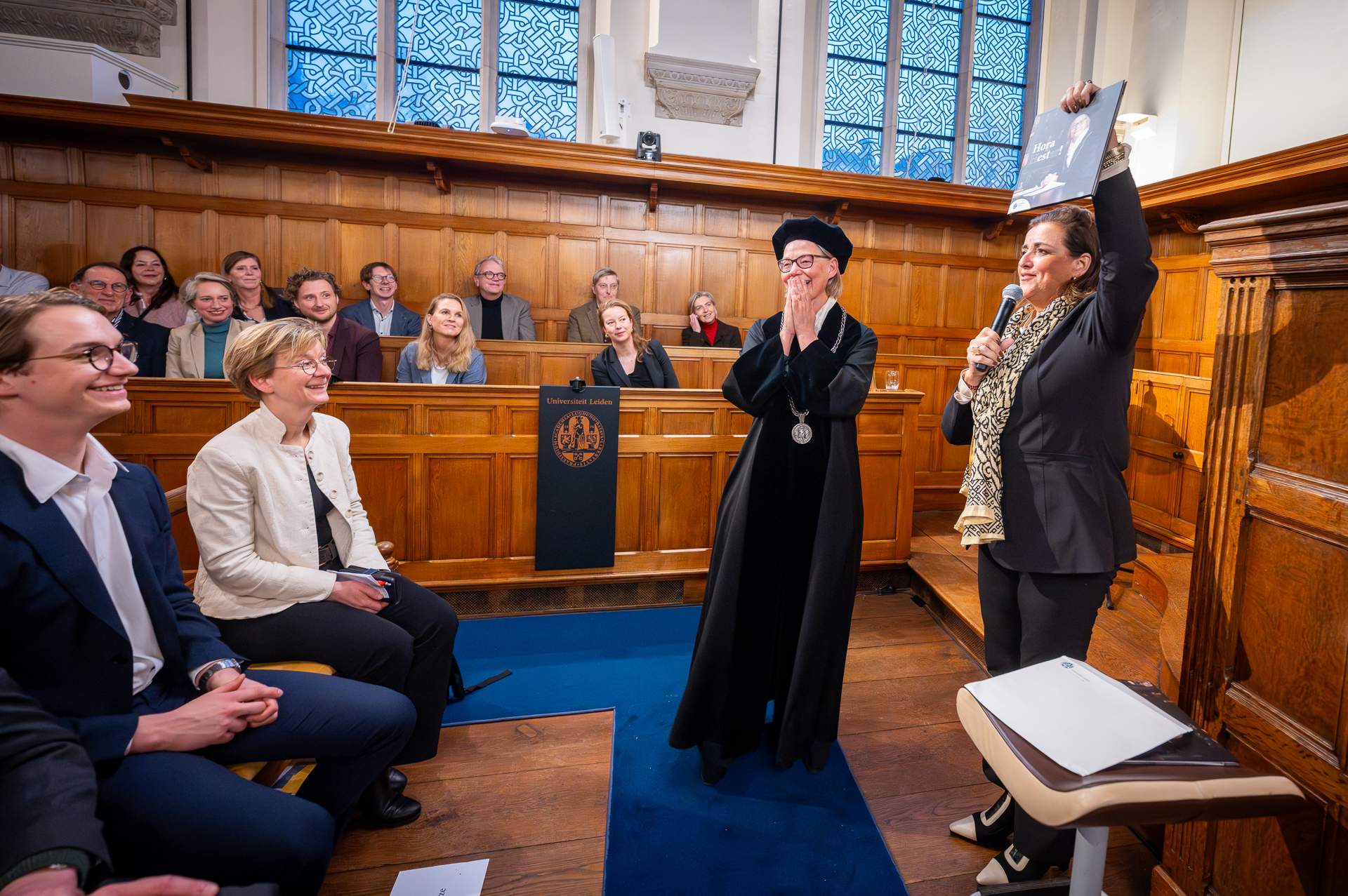 Geroerd bedankte Bijl aan het eind iedereen met wie ze heeft samengewerkt: alle medewerkers, studenten en partners van buiten de universiteit. Ook zij blikte in haar afscheidsrede nog een keer terug op de turbulente jaren: van corona en lockdowns tot polarisatie rond de oorlogen van nu. Juist in zulke tijden is dialoog essentieel, benadrukte ze. Bijl noemde academische vrijheid ‘het grootste goed van een universiteit’, maar waarschuwde dat deze onder druk staat door geopolitiek, politieke inmenging en financieringsvoorwaarden. Tegelijkertijd merkte ze op dat activisme en botsende perspectieven ‘de universiteit levend maken’. Bij een terugblik past ook kritische reflectie, stelde ze. ‘Ik heb geleerd van de dingen die minder goed gingen. Bijvoorbeeld dat er bij een rood sein meer overleg nodig is.’ Ondanks moeilijke en kritische momenten overheerst dankbaarheid, aldus Bijl. ‘Ik voelde me gedragen door velen.’ Presentator Renée Merkx sloot af met een toepasselijke, voor de gelegenheid aangepaste academische term: ‘Hora Hester!’
