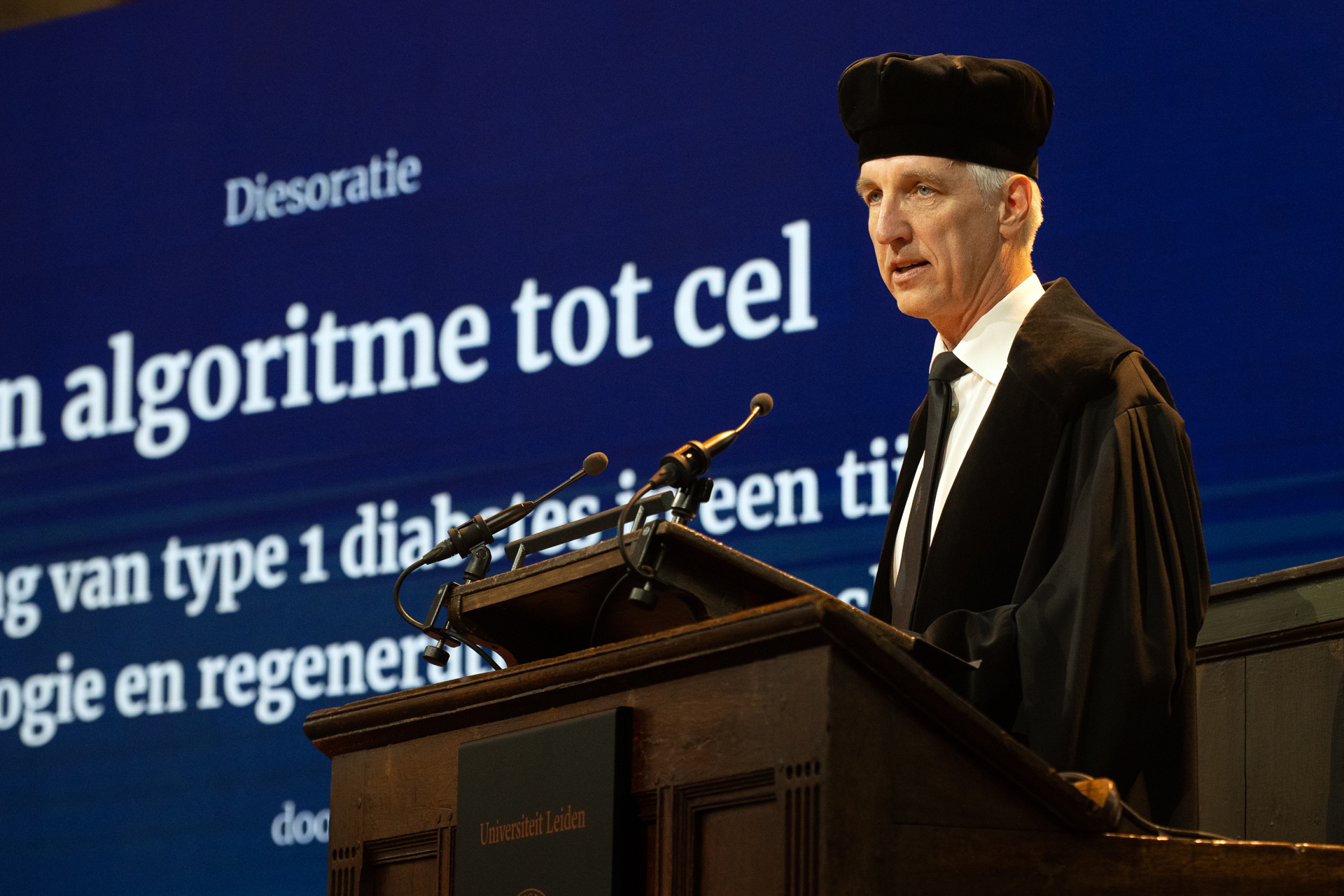 ‘Dokter, denkt u dat ik genezing van type 1 diabetes nog mee zal maken?’ Dat is een vraag die diesorator Eelco de Koning, hoogleraar diabetologie bij het Leids Universitair Medisch Centrum, regelmatig krijgt in zijn spreekkamer. Genezing, zo liet de hoogleraar zien, kent vele benaderingen en vervolgvragen. Zelf werkt hij aan genezing van deze ziekte via de zogeheten regeneratieve geneeskunde. Zijn onderzoeksgroep kweekt in het lab insulineproducerende cellen uit stamcellen en kan genetische veranderingen aanbrengen op die cellen. ‘Dit biedt een mogelijkheid voor oplossingen waarbij afstotingsremmende medicatie niet meer nodig is. Dat betekent: hoop. Niet alleen voor een kleine groep, maar uiteindelijk voor iedereen met type 1 diabetes.’